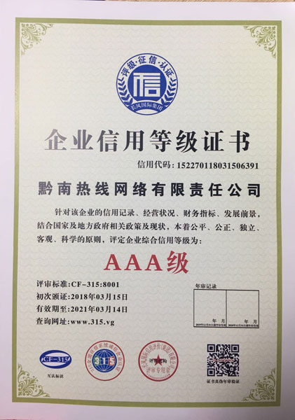 2018年3月15日,黔南热线顺利通过国内权威信用认证和测评机构的信用评价、综合评审及征信调查,成功通过AAA级信用企业认证。AAA作为最高等级,反映了黔南热线优秀的信用记录,良好的经营状况,稳定的运营能力,以及积极的发展前景。