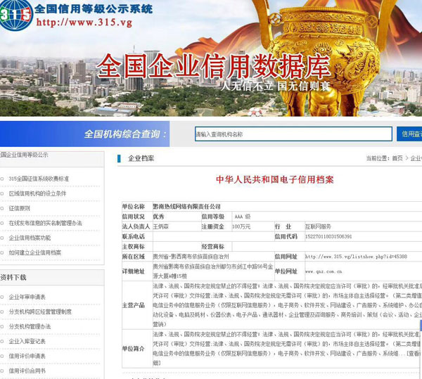 在“全国信用数据库”中的信用档案 黔南热线成立于2005年12月,是黔南州唯一获得《中华人民共和国增值电信经营许可证》及《网络经营许可证》的互联网企业。作为中共黔南州委宣传部领导下的黔南州第一综合门户网站,是我州党委政府指定的对外宣传《权威发布》的主要平台,2015年2月3日,被贵州省通信行业协会、贵州省互联网协会评为“2014年贵州省十佳优秀增值电信业务企业”,2016年10月23日,荣获中国大西南网络新媒体联盟2015-2016年度“十大最具影响力网站”荣誉称号,还连续被评为“黔南州文明单位”,本次AAA信用等级认证的通过是对黔南热线网络有限责任公司服务、管理、诚信的高度肯定,也是对公司价值的最高体现,黔南热线也将继续秉承诚信经营的理念,围绕黔南州综合门户网站的目标,结合党委政府信息化建设的要求和网民的需求做强做大、做深做透。 (编辑:罗春菊 审核编辑:邹骐聪) |