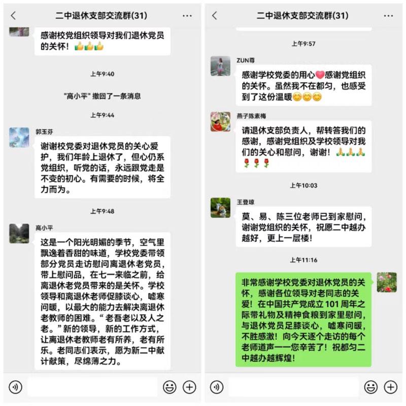 同时在都匀二中退休支部交流群里老党员们也纷纷表示,感谢党组织的关心关怀,沉甸甸的纪念章戴在胸前,更加感到责任重大,同时也深受鼓舞、倍感振奋。作为老党员,一定不辜负党多年来的培养和教育,继续发挥自身作用,为都匀二中教育事业高质量发展献计献策。